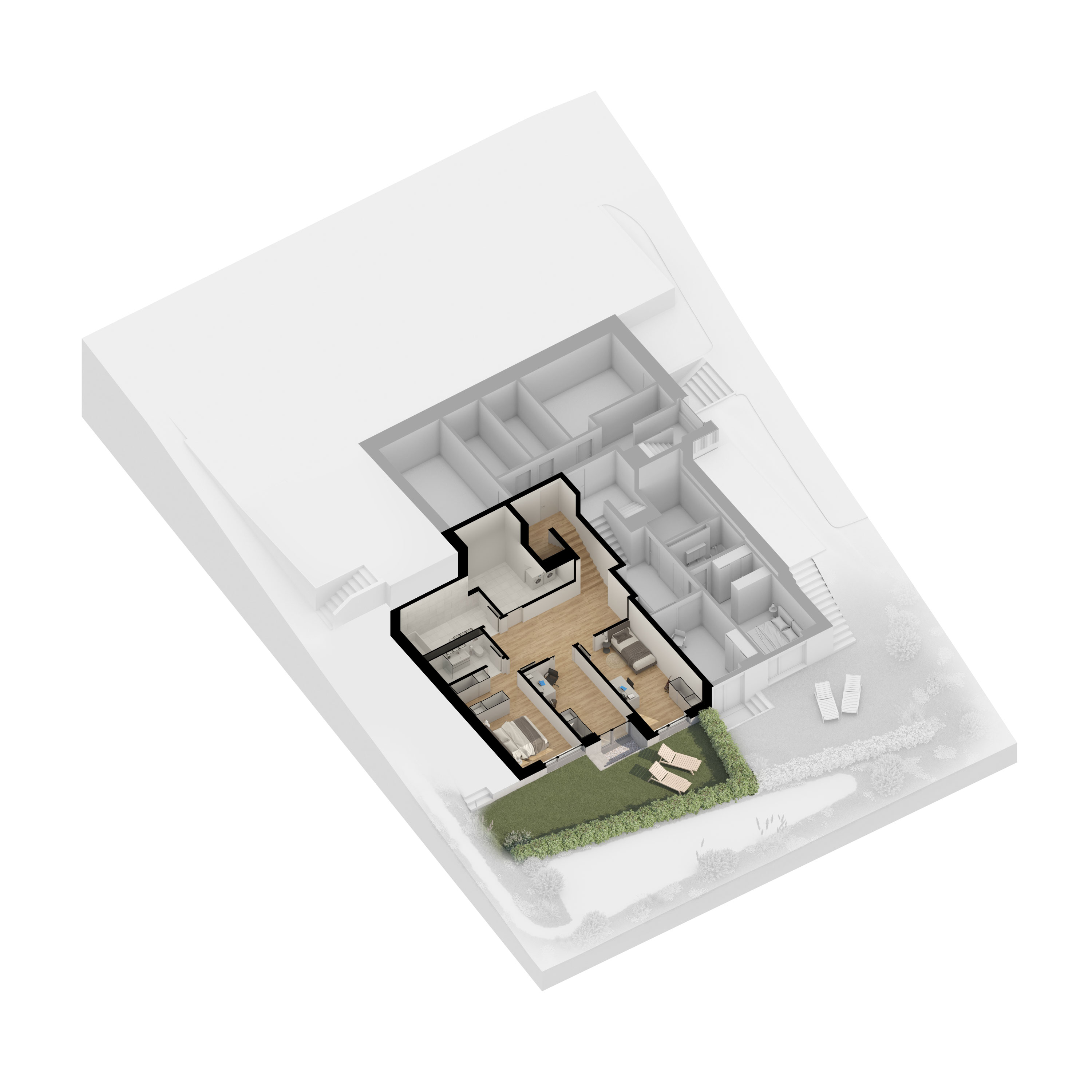 Axonometrical views as a support for sales presentations and brochures for interior volume explanation.